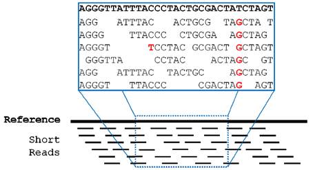 NGS makes many copies of the DNA or RNA then sequences millions of overlapping short segments in parallel, as shown below. In the short-read alignment problem, the aligner must determine where in the reference genome each short-read originated. Making this problem more difficult, the short-reads of approximately 100 base pairs (bps) potentially contain errors, including inserted bases, deleted bases and incorrectly read bases. The red T on the left-hand side of the figure demonstrates a read error. There are also reads that do not map directly to the reference genome because of a genetic variant in the individual being sequenced. The red Gs in the figure below demonstrate this situation. At this position in the reference genome there is a T base, but the sequenced individual has a G base instead. Discovering these variations is usually the motivation for sequencing a specific individual.