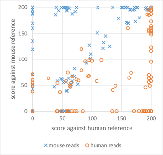 Using the FPGA accelerated short-read aligner described above, we can align xenograft reads against both the human and mouse reference genome more quickly and accurately than software aligners. After performing both alignments, a variety of classification schemes are possible. The simplest scheme classifies reads as originating from mouse or human cells depending on the higher alignment score. In the chart above, this means that reads in the bottom-right half would be classified as human and reads in the top-left half would be classified as mouse. By observing the small number of Xs and Os on the wrong side of the diagonal you can see that such a simple classification scheme is good, if imperfect.