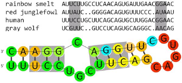 The sequence and secondary structure for the IRE ncRNA in four different species, with a covarying region highlighted